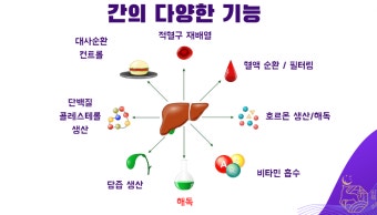해독 작용: 우리가 먹는 음식, 마시는 술, 먹는 약, 심지어 호흡하는 공기 속 독소까지. 간은 하루 종일 쉬지 않고 이 모든 걸 해독해요. 간이 없으면 우리 몸은 독소로 가득 차게 되는 거죠.