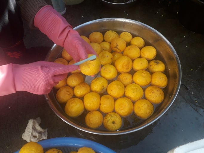 베이킹소다나 굵은 소금을 뿌려서 유자 표면을 꼼꼼하게 문질러 씻어주세요. 왁스나 농약 잔여물을 완벽하게 제거하는 게 핵심이에요. 그 다음 흐르는 물에 3번 이상 헹구고, 물기를 완전히 제거해주세요. 저는 보통 씻고 나서 한 시간 정도 채반에 말려둬요.