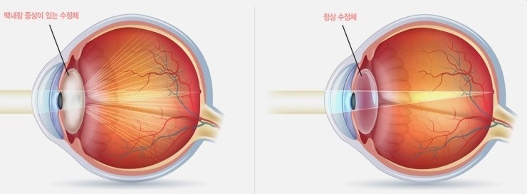 정상적인 수정체는 투명해요. 하지만 나이가 들거나 다양한 원인으로 수정체의 단백질이 변성되면서 불투명해지고, 결국 백내장이 발생하는 거죠.