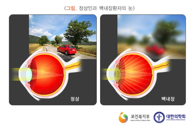 백내장은 눈 속 수정체가 흐려지는 질환이에요. 수정체는 카메라 렌즈 같은 역할을 하는데, 이게 뿌옇게 변하면서 시야가 뿌옇게 보이는 거예요.